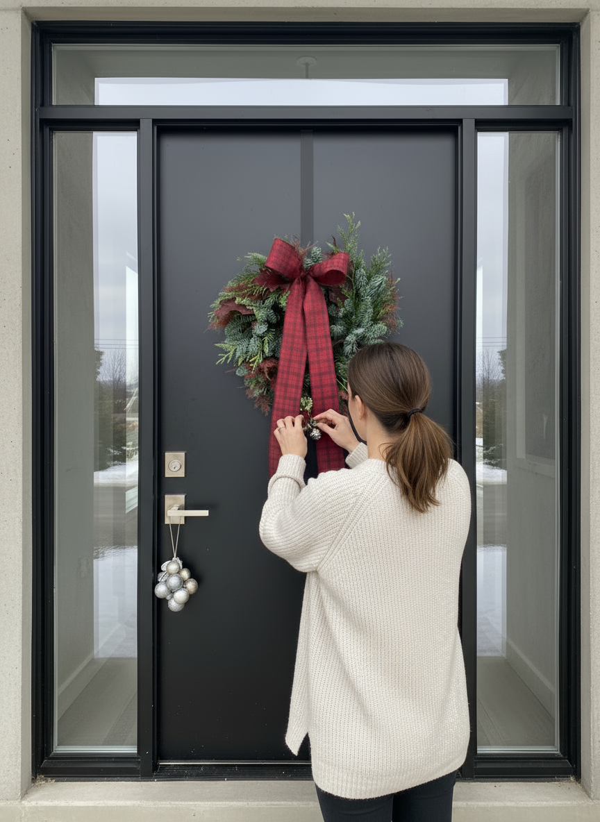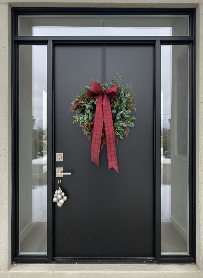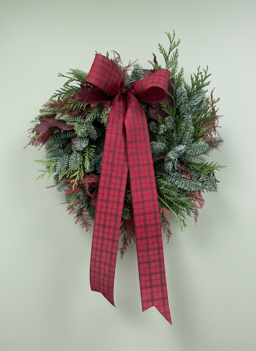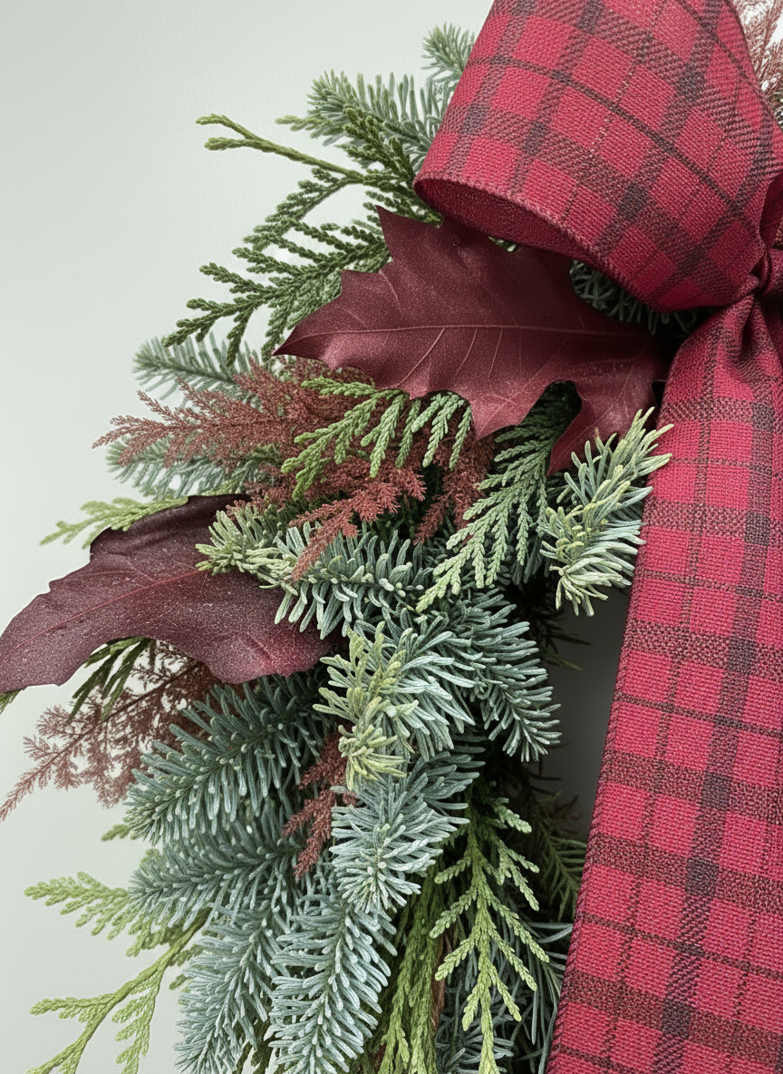 -Corona artesanal elaborada con ramas frescas de abeto y eucalipto. -Lazo de tela roja con estampado tradicional navideño. -Detalles naturales que aportan textura y volumen.