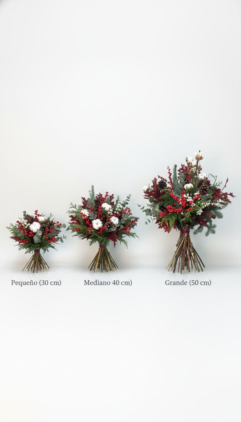 Un ramo que huele a hogar y a Navidad. Creado a mano con cariño, combina el verde del abeto, el rojo intenso de las bayas y el blanco invernal del algodón. Es el detalle perfecto para llenar cualquier rincón de magia, calidez y emoción en estas fechas.